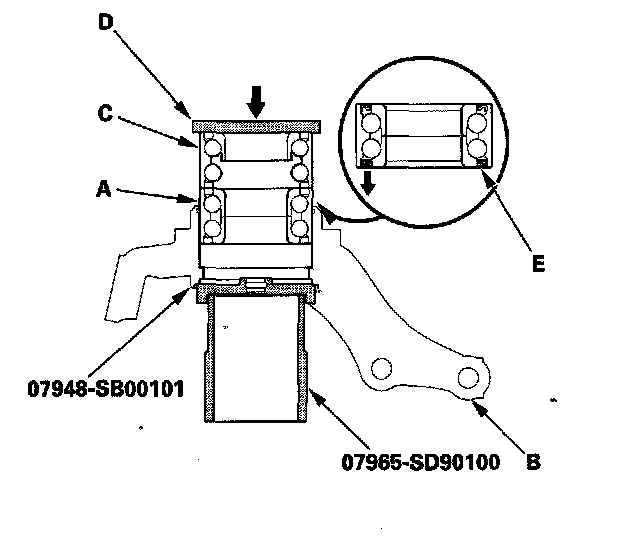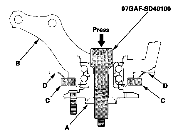 1. Separate the hub (A) from the knuckle (B) using the hub dis/assembly tool and a hydraulic press. Hold the knuckle with the attachment (C) of the hydraulic press or equivalent tool. Be careful not to deform the splash guard (D). Hold onto the hub to keep it from falling when pressed clear.
