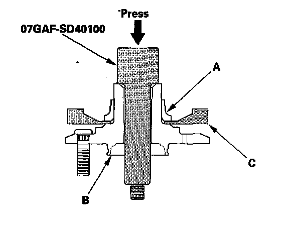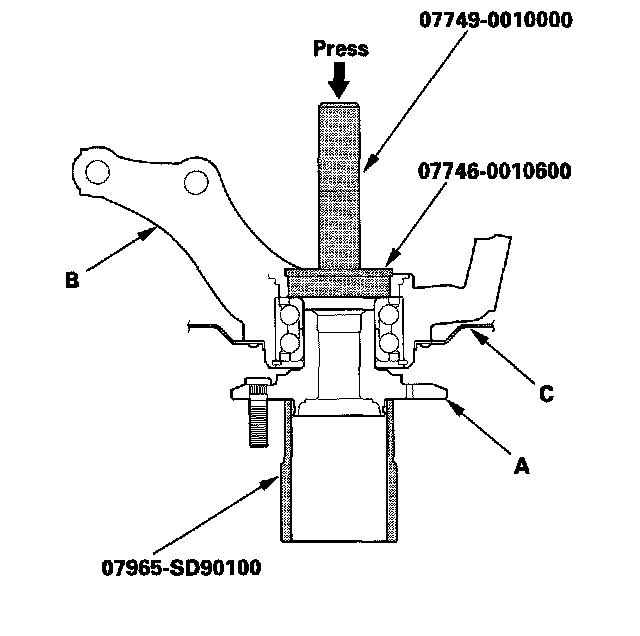 9. Install the hub (A) onto the knuckle (B) using the attachment, the driver, the support base, and a hydraulic press. Be careful not to distort the splash guard (C).
