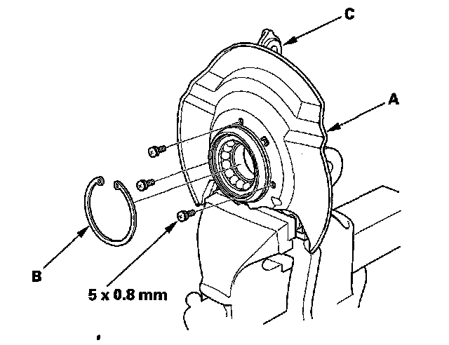 3. Remove the splash guard (A) and the snap ring (B) from the knuckle (C).