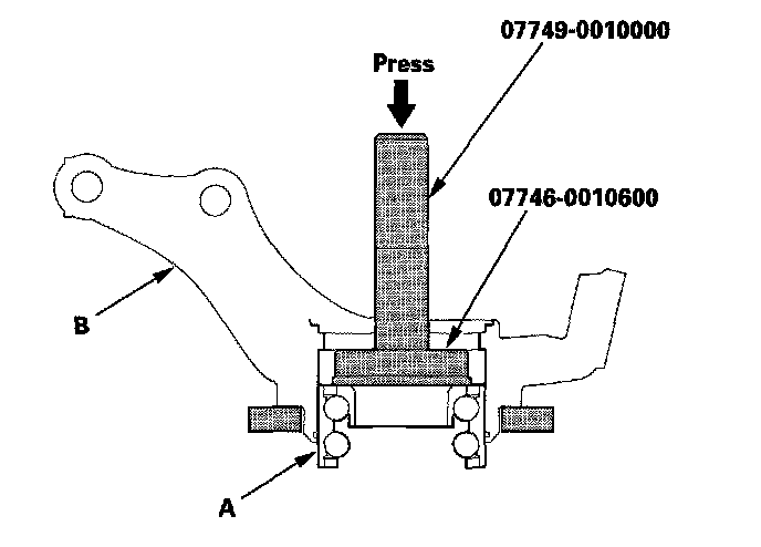 4. Press the wheel bearing (A) out of the knuckle (B) using the attachment, the driver, and a press.
