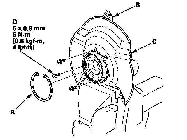 6. Press a new wheel bearing (A) into the knuckle (B) using the old bearing (C), a steel plate (D), the attachment, the support base, and a press.
