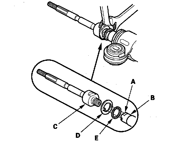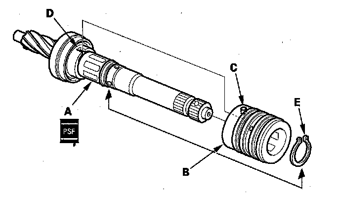 41. Apply power steering fluid to the surface of the pinion shaft (A). Slide the sleeve (B) onto the pinion shaft by aligning the locating pin (C) on the inside of the sleeve with the cutout (D) in the shaft. Then install the new snap ring (E) securely in the pinion shaft groove. Be careful not to damage the valve seal ring when inserting the sleeve.