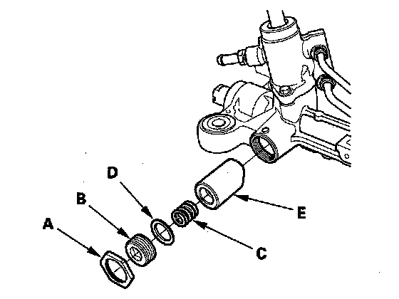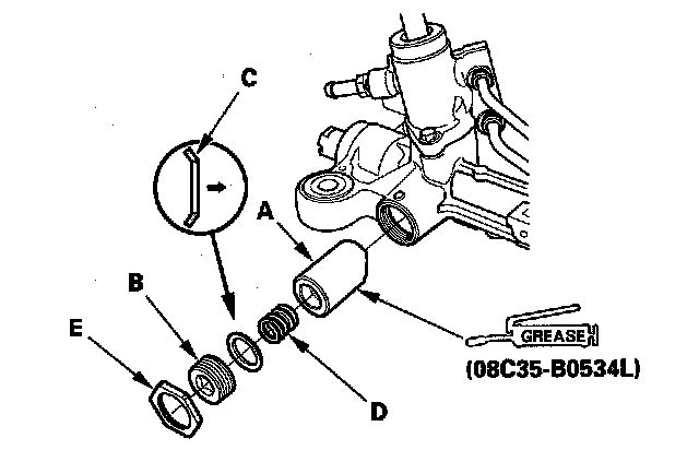 7. Remove the spring (C), disc washer (D), and the rack guide (E) from the gearbox housing.