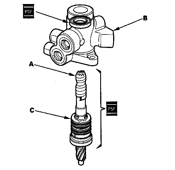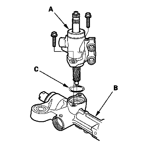 10. Remove the two flange bolts, then remove the valve body unit (A) from the steering gearbox (B). Remove the O-ring (C).