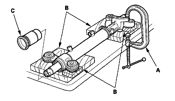 12. Hold the gearbox housing using a C-clamp (commercially available) (A) and the wooden blocks (B) as shown. Do not clamp the cylinder part of the gearbox housing in the vise. Then remove the cylinder end (C).