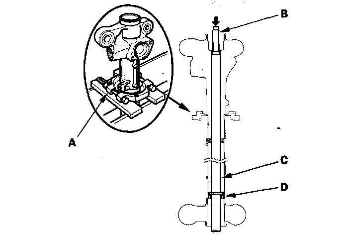 15. Set the steering gearbox in a press so the gearbox housing side points upward, then press the cylinder end seal (D) and steering rack out of the steering gearbox. Hold the steering rack to keep it from falling when pressed clear. Be careful not to damage the inner surface of the cylinder side on the gearbox housing with the tool.