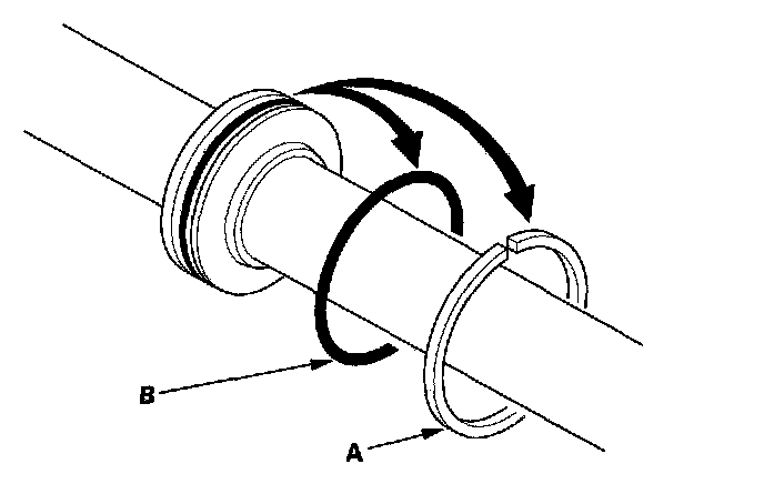 37. Apply power steering fluid to the surface of the sleeve seal ring guide. Slip two new seal rings (A) over the ring guide from the smaller diameter end, and expand them. Install only two rings at a time from each end of the pinion shaft sleeve (B).