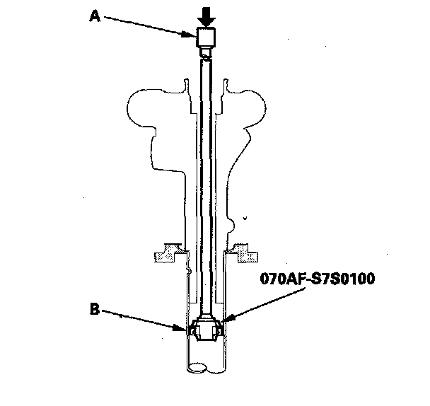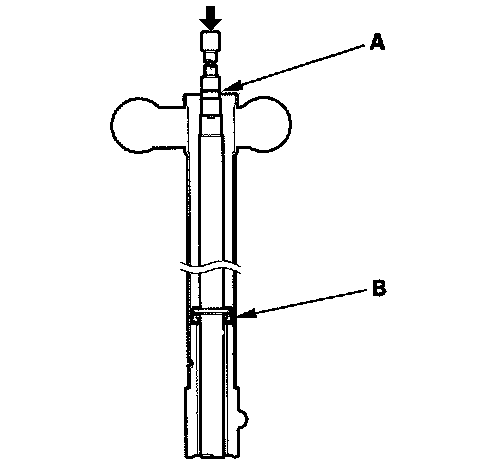 18. Insert a 24" long 3/8" drive extension (A), on the cylinder end seal remover attachment. Place the steering gearbox in a press, then remove the cylinder end seal (B) from the steering gearbox by pressing on the 24" long 3/8" drive extension.
