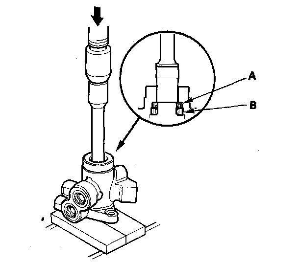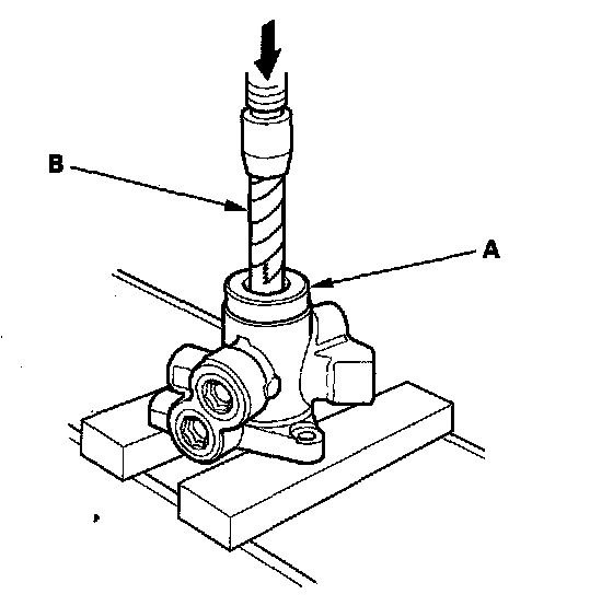 42. Apply power steering fluid to the seal ring lip of the new valve oil seal (A), then install the seal in the valve housing (B) using a hydraulic press and driver. Install the seal with its grooved side facing the tool.