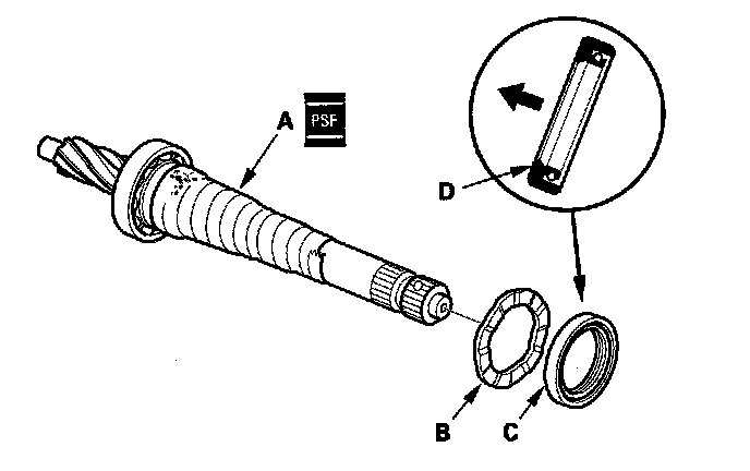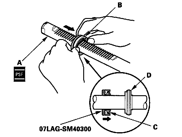 55. Install the cylinder end seal (B) onto the steering rack with its grooved side (C) toward the piston (D).