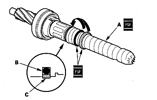 33. Fit the new O-ring (B) in the groove of the pinion shaft. Then slide the new valve seal ring (C) over the shaft and in the groove on the pinion shaft.