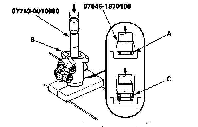 43. Press the roller bearing (C) into the valve housing with a hydraulic press and attachment.