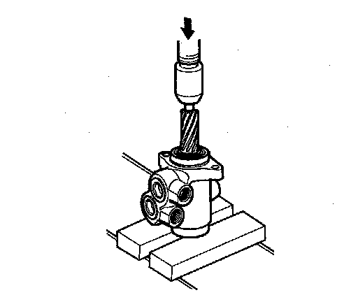 ^ Use a press to remove the cylinder end seal. Do not try to remove the seal by striking the tool; striking the tool would break the cylinder end seal, and the seal would remain in the steering gearbox.
