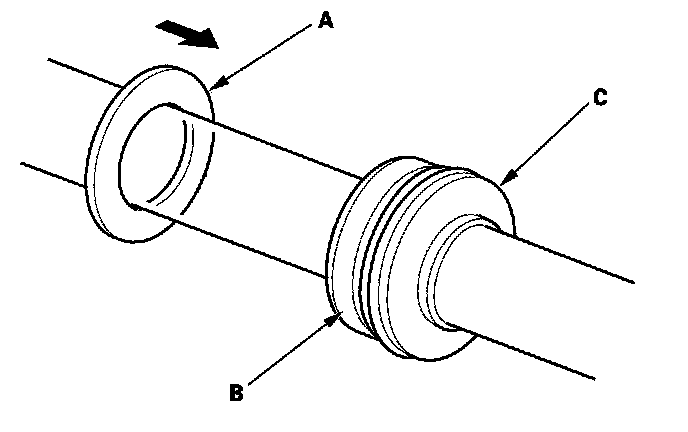 57. Install the new backup ring (A) on the steering rack, then place the backup ring and cylinder end seal (B) against the piston (C).
