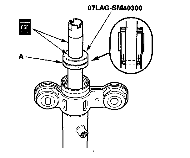 17. Turn the cylinder end seal remover attachment so it will fit through the rack guide hole of the steering gearbox, then position the seal remover on the cylinder end seal (A). Make sure that the seal remover is securely positioned on the seal edges.