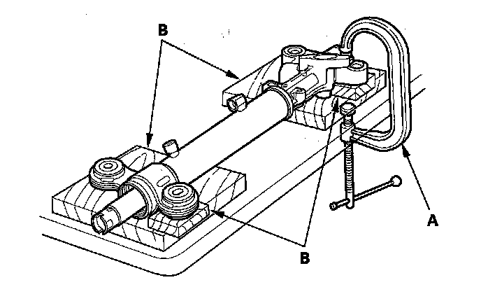 66. Hold the gearbox housing using a C-clamp (commercially available) (A) and the wooden blocks (B). Do not clamp the cylinder part of the gearbox housing in the vise.