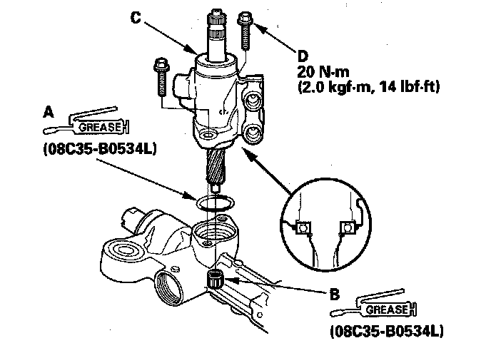 31. Coat the inside surface of the new valve oil seal (C) with power steering fluid, and install the seal with its grooved side facing opposite the bearing, then slide it over the pinion shaft, being careful not to damage its sealing lip (D).