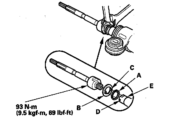 74. Remove the old sealant from the rack guide screw (B), then apply new sealant (Three Bond 1215 or Loctite 5699) to the middle of the threads. Install the disc washer (C) with its convex side facing the rack guide, the spring (D), rack guide screw, and locknut (E).