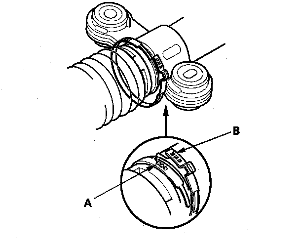 84. Install the new boot bands by aligning the tabs (A) with the holes (B) on the band.