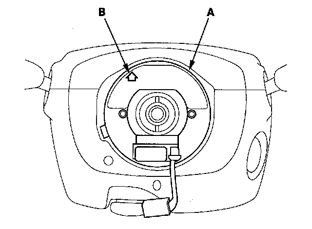 Steering Wheel Installation1. Before installing the steering wheel, make sure the front wheels are aligned straight ahead, then center the cable reel (A). Do this by first rotating the cable reel clockwise until it stops. Then rotate it counterclockwise about three full turns. The arrow mark (B) on the cable reel label should point straight up.