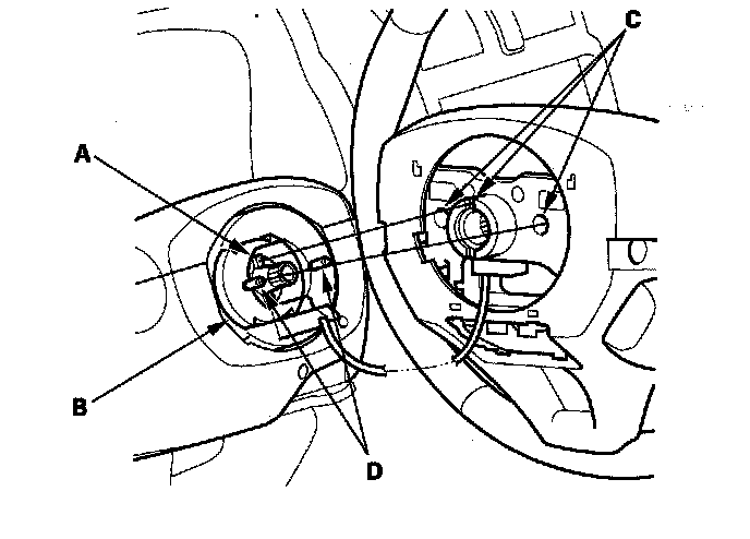 2. Position the two tabs (A) of the turn signal canceling sleeve (B) as shown. Install the steering wheel on to the steering column shaft, making sure the steering wheel hub (C) engages the pins (D) of the cable reel and the tabs of the turn signal canceling sleeve. Do not tap on the steering wheel or steering column shaft when installing the steering wheel.