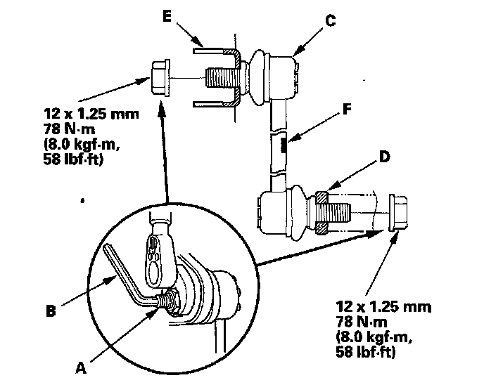 4. Install the stabilizer link on the stabilizer bar (D) and the damper (E) with the joint pins set at the center of their range of movement.
