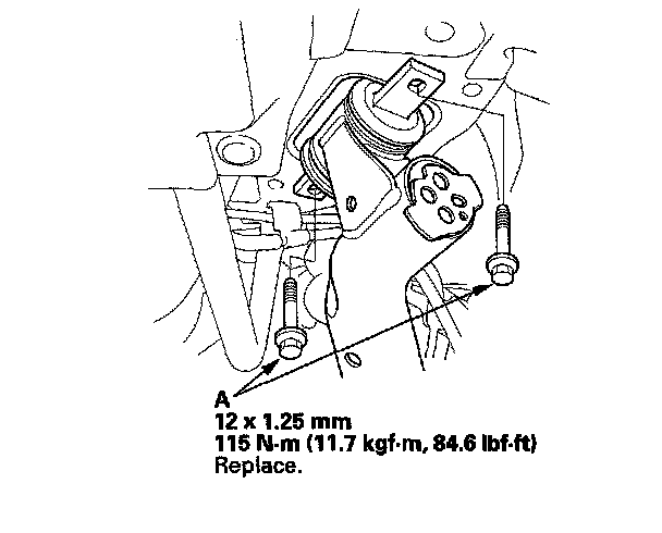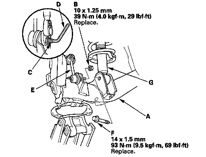 6. Remove the flange bolt (F), and disconnect the damper (G) from the trailing arm.