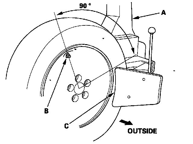 ^ Position the wheel as shown so the valve stem (B) is 90 degrees from the bead breaker (C) as shown.