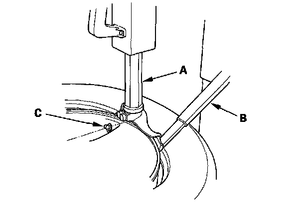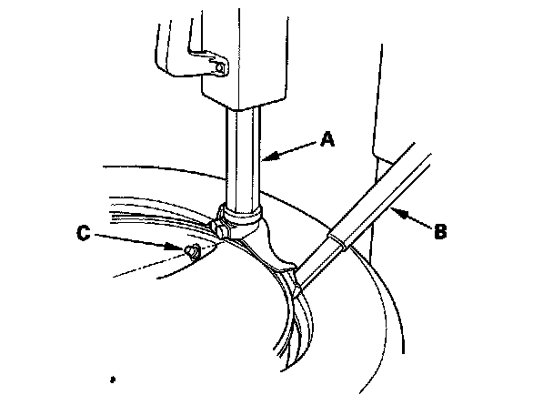 5. Position the wheel so the tire machine (A) and tire iron (B) are next to the valve stem (C) and will move away from it when the machine starts. Then remove the tire from the wheel.