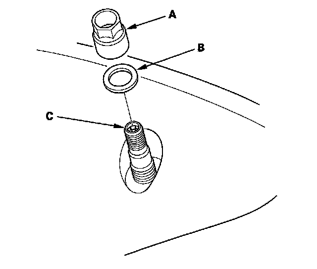 6. Remove the valve stem nut (A) and washer (B), then remove the tire pressure sensor with valve stem (C) from the wheel.
