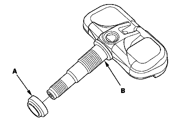 7. Remove and discard the valve stem grommet (A) from the tire pressure sensor (B).