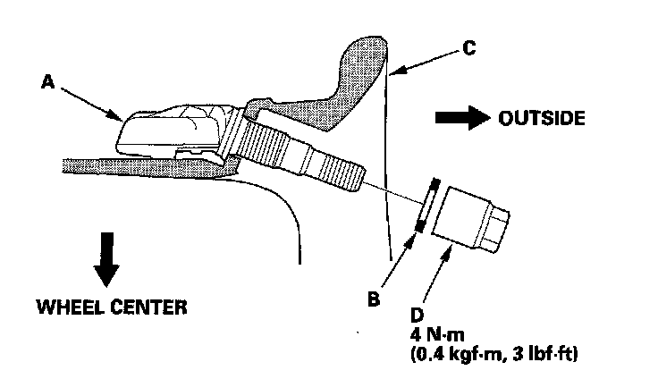 2. Install the tire pressure sensor (A) and the washer (B) to the wheel (C), and tighten the valve stem nut (D) finger tight. Make sure the pressure sensor is resting on the wheel.