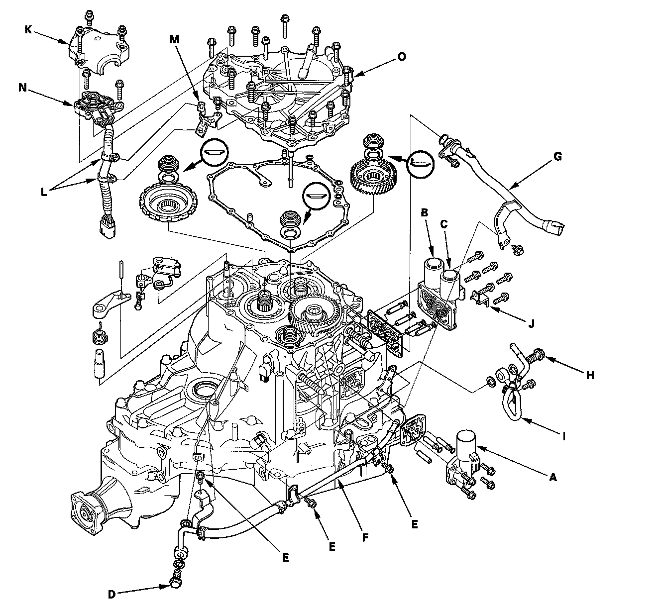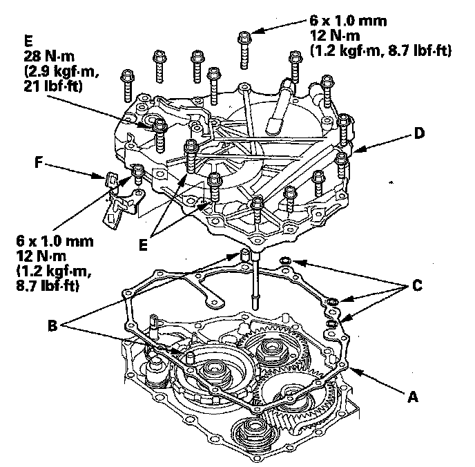 NOTE: Replace the end cover, if the 1st clutch ATF feed pipe (E) replacement is required.