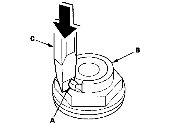 12. Cut the lock tab (A) of the each shaft locknut (B) using a chisel (C). Then remove the locknuts and conical spring washers from each shaft.