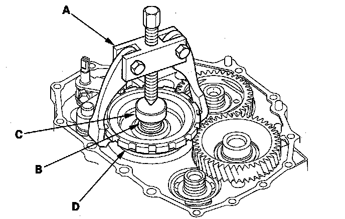 14. Set a two-jaw (or three-jaw) puller (A) on the countershaft (B) by putting a spacer (C) between the puller and countershaft, then remove the park gear (D).