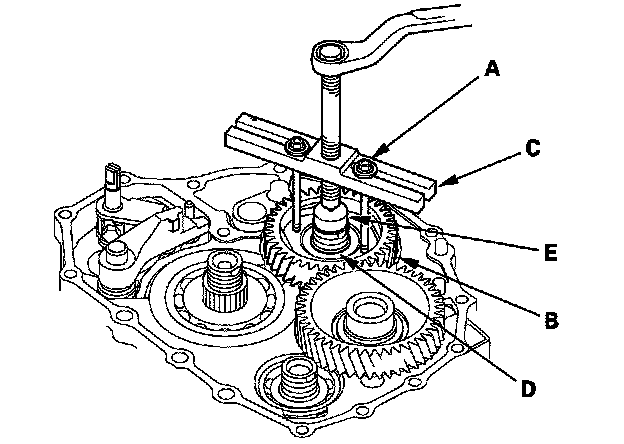 15. Install a 6 x 1.0 mm bolts (A) on the mainshaft idler gear (B). Set a puller (C) on the mainshaft (D) with putting a spacer (E) between the puller and mainshaft, then remove the mainshaft idler gear.