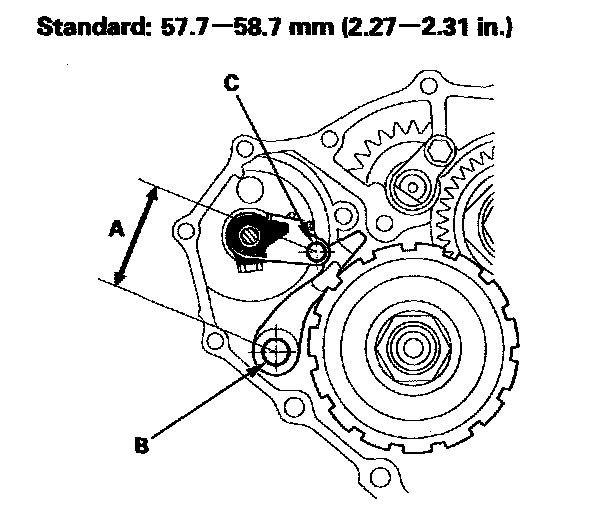 2. Measure the distance (A) between the park pawl shaft (B) and the park lever roller pin (C).