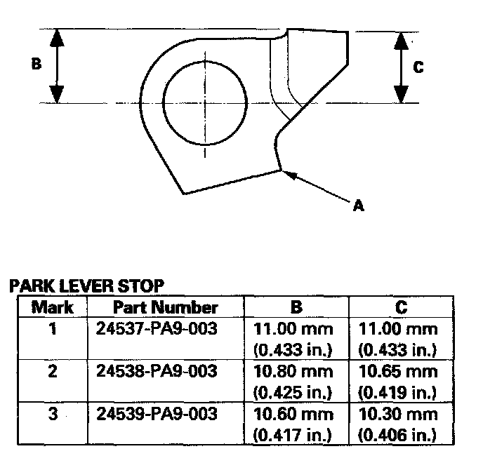 3. If the measurement is out of standard, select and install the appropriate park lever stop (A) from the table.