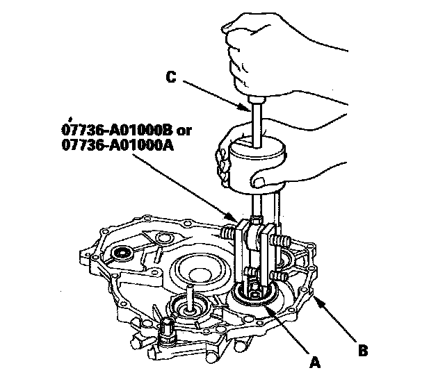 1. Remove the idler gear shaft bearing (A) from the end cover (B) using the adjustable bearing puller and a commercially available 3/8"-16 slide hammer (C).