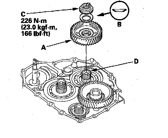 3. Install the mainshaft idler gear (A), old conical spring washer (B), and old locknut (C) on the mainshaft (D), and tighten the locknut to 226 N-m (23.0 kgf-m, 166 lbf-ft).