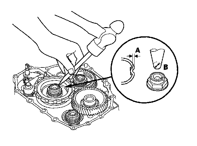 14. Stake the locknuts into the shafts in depth (A) of 0.7-1.3 mm (0.03-0.05 in.) using a 3.5 mm punch (B).