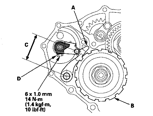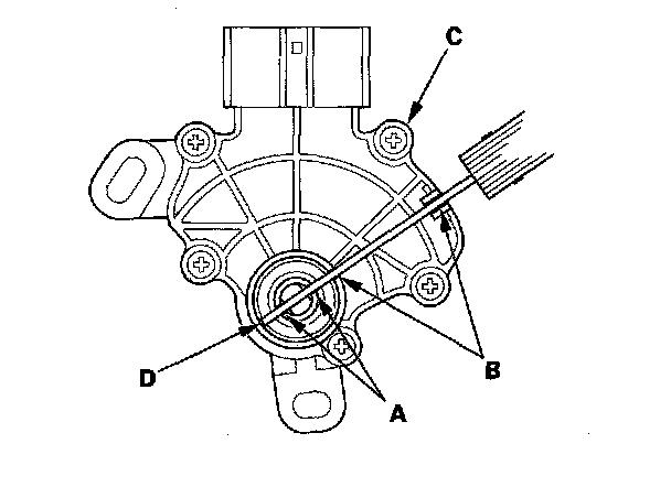 24. Align the cutouts (A) on the control shaft with the neutral positioning cutouts (B) on the transmission range switch (C), then put a 2.0 mm (0.08 in.) feeler gauge blade (D) in the cutouts to hold in the N position.