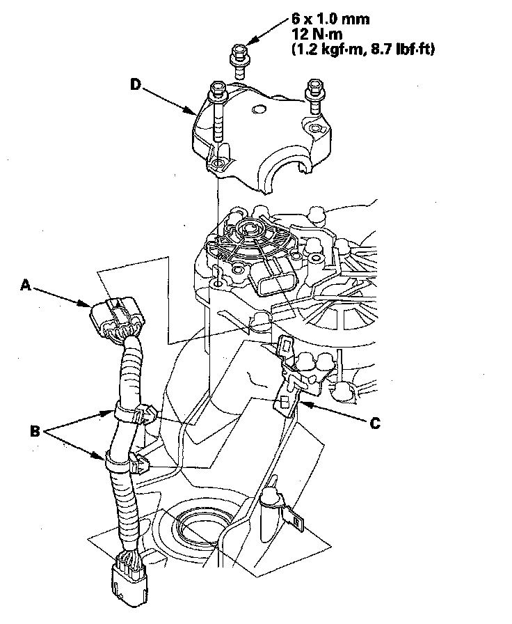 34. Install the ATF cooler inlet line (A) with the line bolt (B) and new sealing washers (C), and secure the inlet line with the bolts (D) on the transmission.