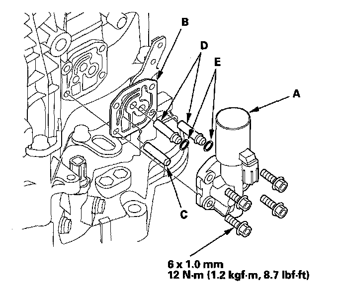 30. Install the new O-rings (E) over the ATF joint pipes, and install A/T CLUTCH PRESSURE control solenoid valve A.