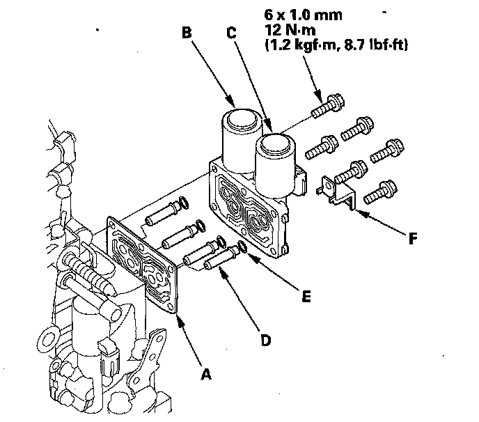 32. Install A/T clutch pressure control solenoid valve B and C, and the harness clamp bracket (F).