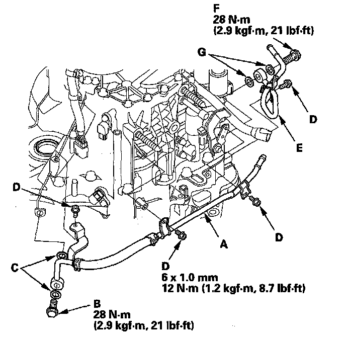 35. Install the ATF cooler outlet line (E) with the line bolt (F) and new sealing washers (G), and secure the outlet line with the bolt on the transmission.