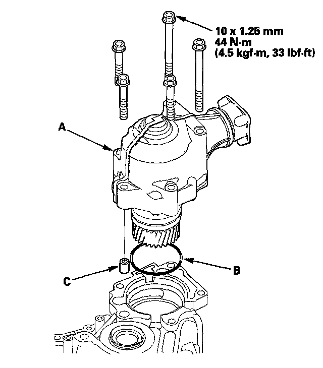 37. 4WD model: Install the transfer assembly (A) with the new O-ring (B) and dowel pin (C).