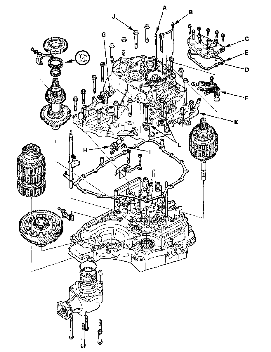5. Remove the transmission housing mounting bolts (J) (20 bolts), transmission hanger (K), and harness clamp brackets (L).