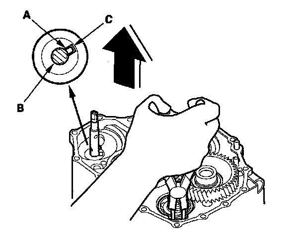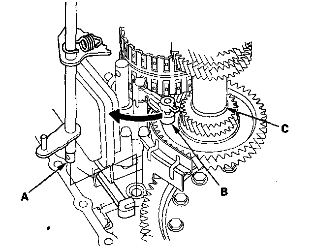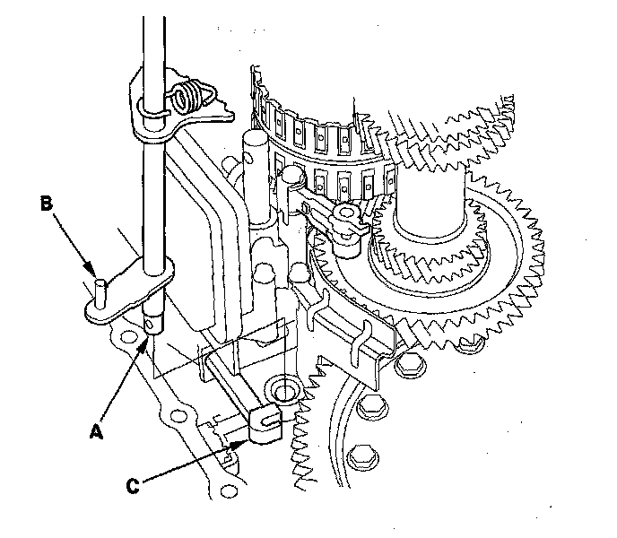 6. Align the spring pin (A) on the selector control shaft (B) with the transmission housing groove (C) by turning the control shaft with the control lever.