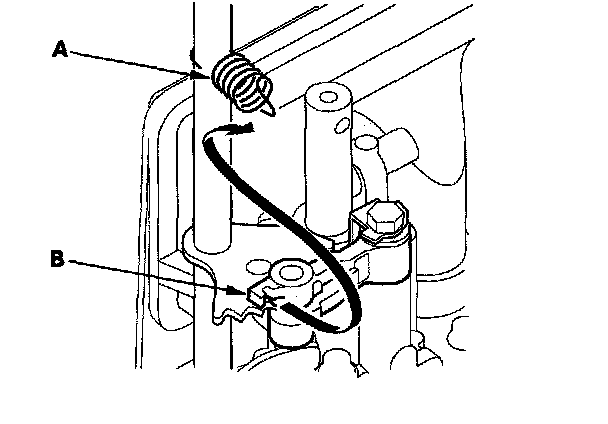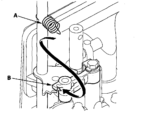 8. Hook the detent arm spring (A) to the detent arm (B).